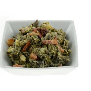Verse bereide stamppot van aardappelpuree, andijvie en spekjes.