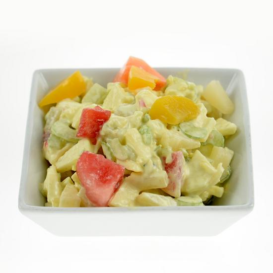 bleekSELDERIJ, appel, ananas, perzik, meloen,Raapzaadolie, 20% SELDERIJ, 14% kippenvlees, water, suiker, magere MELK, ZURE ROOM, brandewijnazijn, citroensap, mangomoes concentraat, zout, banaan, ananas, prei, gemodificeerd aardappelzetmeel, KIPPENEIGEEL, verdikkingsmiddelen (E412, E415, E410), conserveermiddelen (E211, E202), specerijen (o.a. MOSTERDZAAD), glucosestroop, kleurstof (beta-caroteen), specerij-extract, voedingszuur (E330).Bewaaradvies