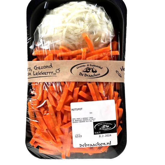 Vers gewassen en gesneden wortel en ui (apart verpakt), een heerlijke basis voor zelfgemaakte hutspot.