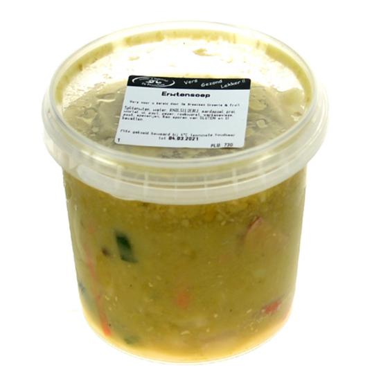 Spliterwten, water, knolSELDERIJ, aardappel, prei, wortel, ui, zout, peper, rookworst, varkensvlees, zout, specerijen, Kan sporen van GLUTEN en EI bevatten.Bereidingsadvies