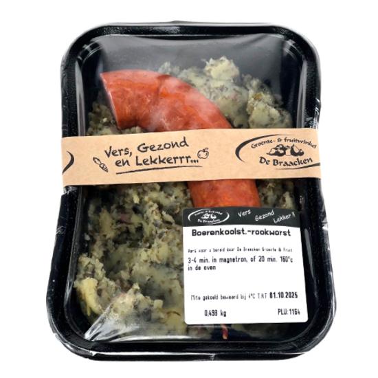 1% aardappelen, 38% boerenkool, 6% gerookte spekblokjes (varkensvlees*, nitrietpekelzout (zout, conserveermiddel (E250)), antioxidant (E301), specerijenextracten, rook), raapzaadolie, water, zout, brandewijnazijn, peper, aroma, natuurlijk aroma 93% varkensvlees, water, zout, dextrose, stabilisator (E450), antioxidanten (E300, E330), kruiden en specerijen, emulgator (E450), aroma, zetmeel (aardappel), suiker, palmvet, rundvleesextract, conserveermiddel (E250), voedingszuur (E262),kleurstof (E120(ii)) rook, varkensdarm.Voedingswaarde per 100g (berekend) Energie 192 kJ 309 kcal Vetten 27,1 g Waarvan verzadigde vetzuren 10,4 gr.Koolhydraten 1,0 g Waarvan suikers 0,5 g Eiwitten 15,3 g Zout 2,1 g